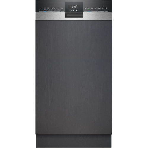 Siemens iQ300 SR53ES25KE. Appliance placement: Semi built-in, Product size: Slimline (45 cm), Door colour: Stainless steel. Number of place settings: 10 place settings, Noise emission class: B, Noise level: 44 dB. Energy efficiency class: B, Water consumption per cycle: 8.7 L, Energy consumption per 100 cycles: 51 kWh. Width: 448 mm, Depth: 573 mm, Height: 815 mm. Package width: 510 mm, Package depth: 670 mm, Package height: 880 mm
